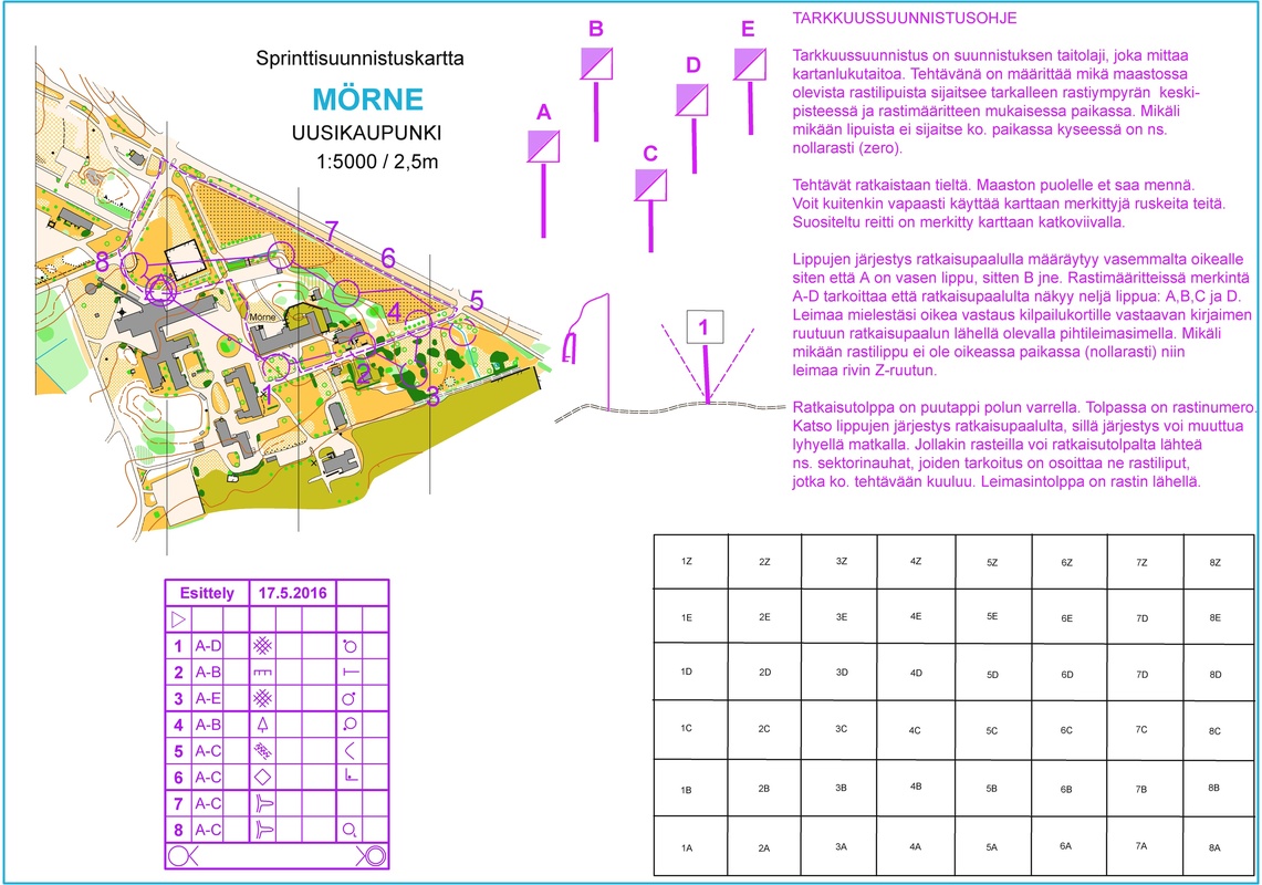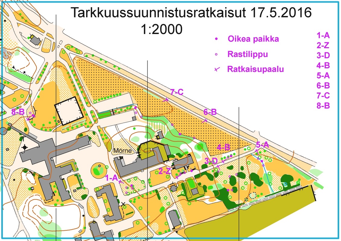 Vakka-Rastin kuntosuunnistuksen yhteydessä pidetty tarkkuussuunnistusesittely oli menestys. Lajiin tutustui peräti 70 osallistujaa 8 rastisella radalla Mörnen sairaala- ja virastotalopuistossa. Osallistujissa oli pitkän linjan suunnistusihmisiä, karttamiehiä, entisiä maajoukkuesuunnistajia, perheitä ja tänä keväänä suunistuskoulun aloittaneitakin. Palaute oli paljon puhuva :" Tämähän on mielenkiintoista. Hienoa kartanlukua. Minulla on ollut ihan väärä käsitys lajista". Vakka-Rastin Veijo Viitanen ja pitkänlinjan suunnistustoimittaja Jussi Arola tekivät loistavan markkinointityön tapahtuman eteen. Pitkin talvea ja kevättä tilaisuutta oli markkinoitu Vakka-Rastin tilaisuuksissa. Viime viikolla Jussi Arola teki hyvän jutun Uudenkaupungin Sanomiin. (liittenä) Radastakin saatiin vaihteleva, vaikkei U:gin niin tyypillisiä avokallioita päästykään kiertelemään. Hyvälle kartalle (L.Kontkanen 2014) oli mukava laatia tehtäviä. Demo-pisteessä opastusta varten oli yksi 5 lipun asema, jolla oli 7 eri tehtävää. Niillä demottiin tarkkuussuunnistuksen idea, lippujen järjestys, leimausruutu, nollarasti ja lähekkäin olevat kohteet. Demo-asema toimi hyvin, sillä osallistujat saivat riittävän monen tehtävän kautta rutiinin itse radalle.