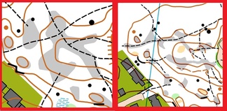 ![]() Vasemmalla Jussi Silvennoisen pelkistämää avokalliomaastoa, oikealla Kontkasen sprinttikartoitusjälkeä samalta alueelta. |