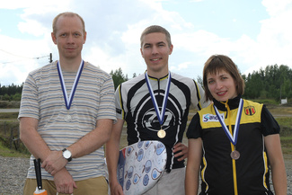 ![]() SM Tempo mitalistit. Vasemmalla Petteri Suominen hopeaa, keskellä Antti Rusanen kultaa ja oikealla Pinja Mäkinen pronssia. Kuva Esko Junttila |