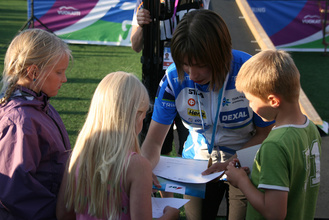 ![]() Tarkkuussuunnistuksen MM-kilpailut Vuokatissa 12.7.2013. Maamme-laulun osasivat mestari Pinja Mäkinen, pronssimitalisti Lauri Kontkanen ja Antti Rusanen, kilpailun neljäs. Ruotsin Marit Wiksell kuunteli tyytyväisenä hopeamitali kaulassaan. Kuva Jukka Liikari | ![]() Tarkkuussuunnistuksen MM-kilpailut Vuokatissa 12.7.2013. Mestarin nimmarit kiinnostivat. Kuva Jukka Liikari |