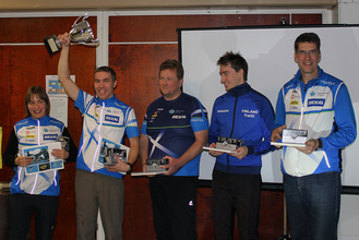 ![]() Maaotteluvoittajat Sastamala 2013: Takana Pinja Mäkinen, Antti Rusanen, Lauri Kontkanen ja Marko Määtälä. Edessä Jari Turto kiertopalkintopokaalin kanssa. | ![]() Suomen maaottelujoukkueet 2013: Edessä II-joukkue: vas. Sami Torstila, Martti Inkinen, Risto Vainio, Anna Jacobson ja Eero Hakanen. Takana Suomi I: vas Lauri Kontkanen, Marko Määttälä, Pinja Mäkinen, Antti Rusanen ja Jari Turto |